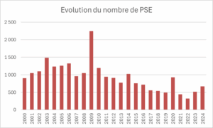 Après avoir atteint un record en 2009 avec la crise des subprimes (2 245), le nombre de plans de sauvegarde de l’emploi (PSE) a régulièrement diminué depuis. En 2024, il s’établit à 670, en légère hausse depuis 2 ans (source : DARES).